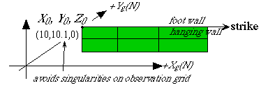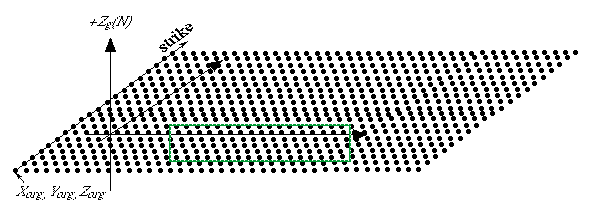 * Xo, Yo, Zo (Ref.corner), strike,dip,length,width:
