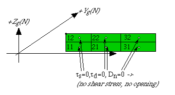 The boundary conditions shown here correspond to code 12 (strike//stress, dip//stress, normal_relative displacement) and are zero for each component. This means that the strike and dip relative displacement at the center of each subelement will be such that the final state of shear stress is zero, and that there is no normal opening or closing. Code 12 0 0 0 is a common bc for freely slipping fault-elements.